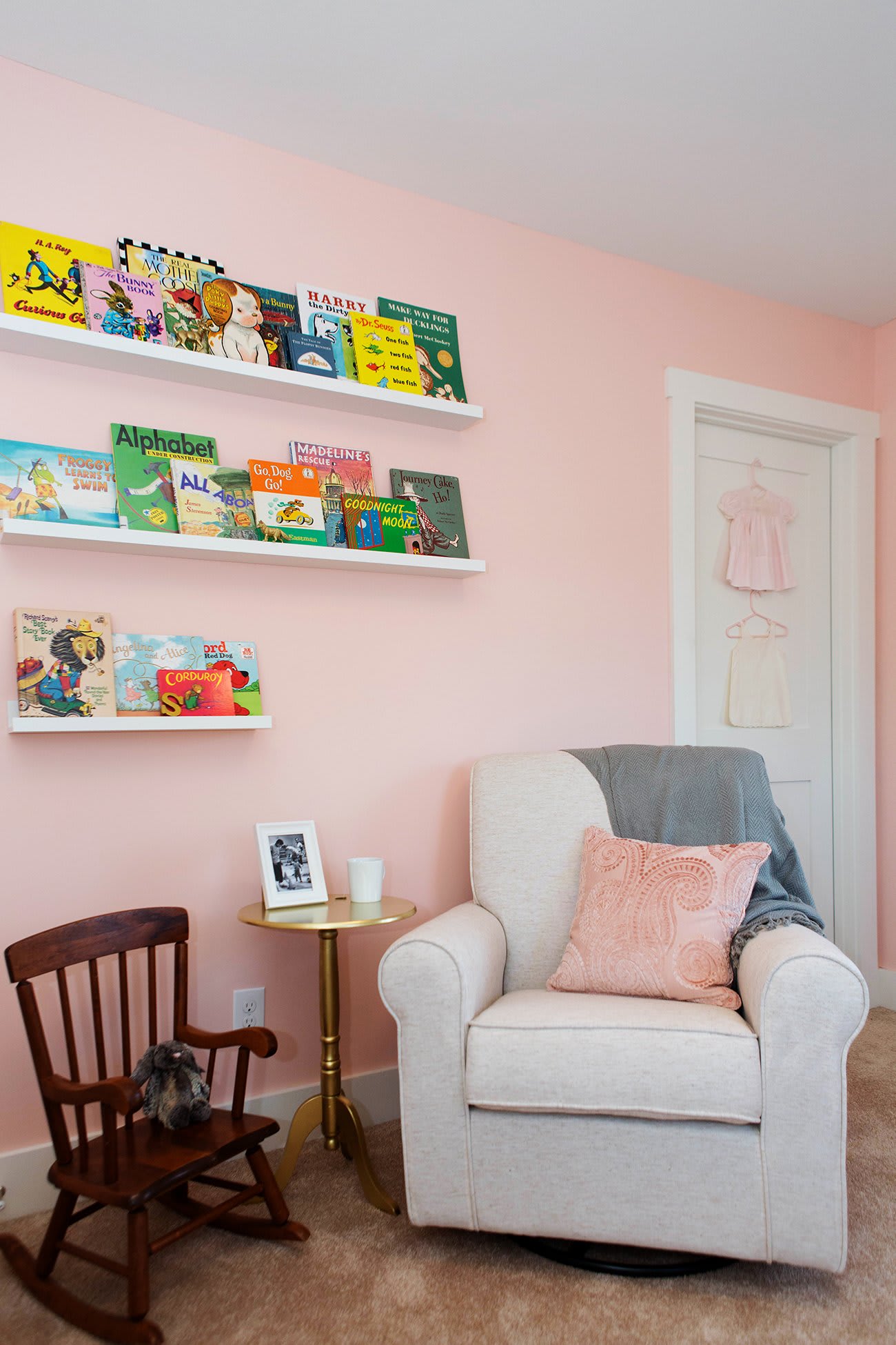 The expectant parents wanted something classic, feminine, and sweet. We established a color palette of soft pink, warm gray, crisp white, and gold accents. To add a bit of dimension and whimsy, we chose a bold floral wallpaper for one accent wall. Michael Riley of Riley Paint & Wallpaper first applied a wallpaper-specific primer before hanging the paper. Once the wallpaper was installed, we enlisted Megan Kauffmann of Feathered Nest to aid in color consultation. Kauffmann chose the warm pink hue Koral Kicks by Sherwin Williams.