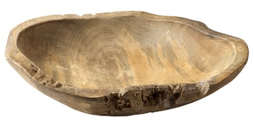 This natural teak wood bowl with its craters and crevices brings an organic shape to a coffee or dining table. Teak Bowl, $20,