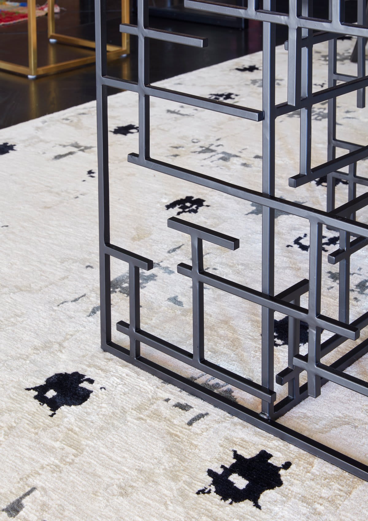 The dramatic canopy bed mimics the height of the room and was brought in from the owner’s previous home and reupholstered in the handsome black and white woven fabric. The bed pillows and bench are done in the epochal Chiang Mai Dragon fabric by Schumacher (the iconic fabric house—no relation to this Schumacher!). If you’re fearful of mixing patterns in your design, don’t be! Follow Schumacher’s advice, “Staying within your desired color palette, mix small-scale prints with large-scale prints for variation.”