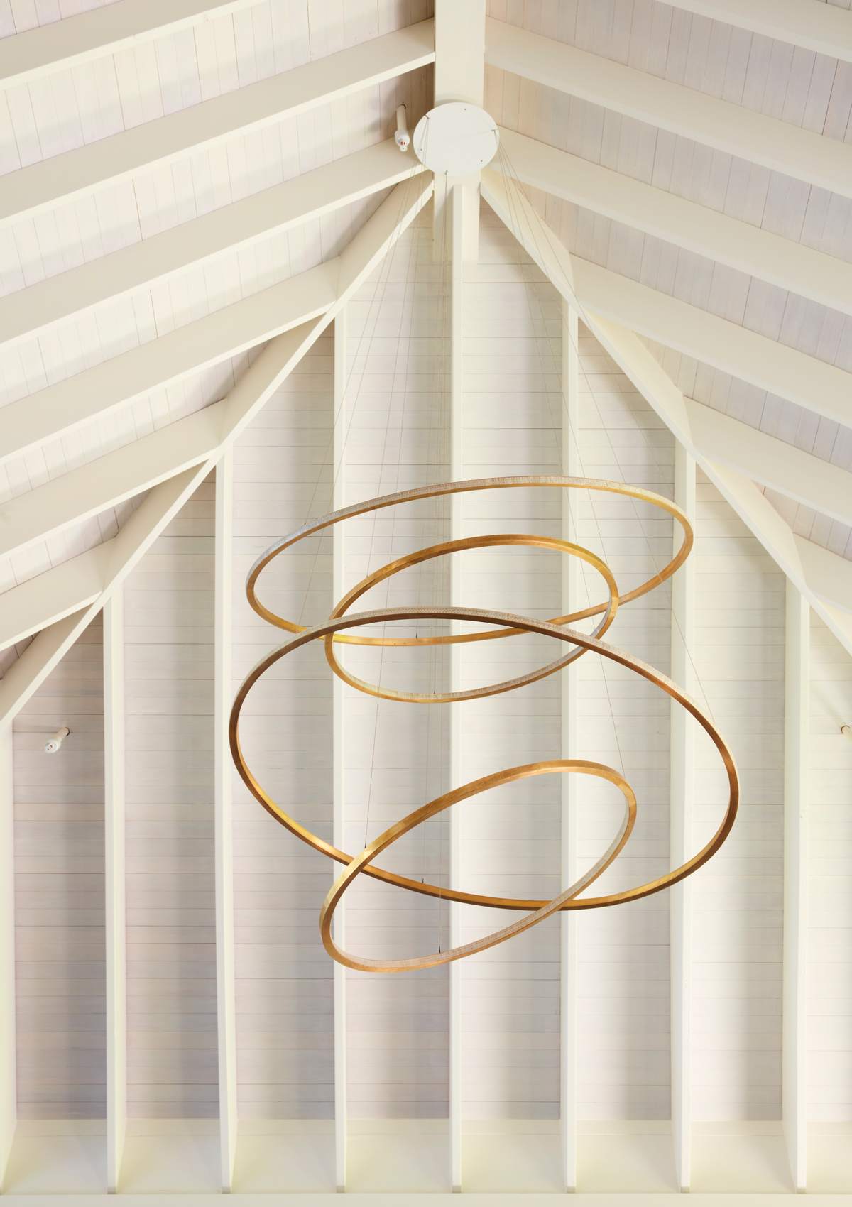 Big, gorgeous, gold rings that add just a touch of bling and glamour. Above the kitchen island, two large pendants in mixed metals carry a distinct Hamptons sentiment. Schumacher’s take on mixing metals? “Mix your metals! It looks less contrived and less like a model home.”