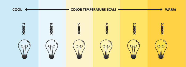 Finally, no matter what type of bulb you choose, remember to take a look at the color listed on the packaging. Bulbs emit light on a spectrum from yellow to blue tones, measured in Kelvins.