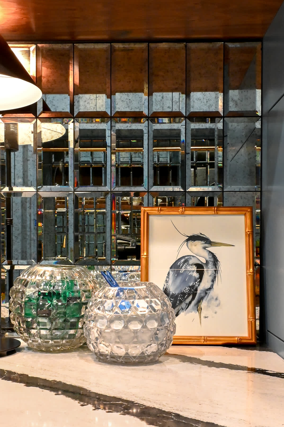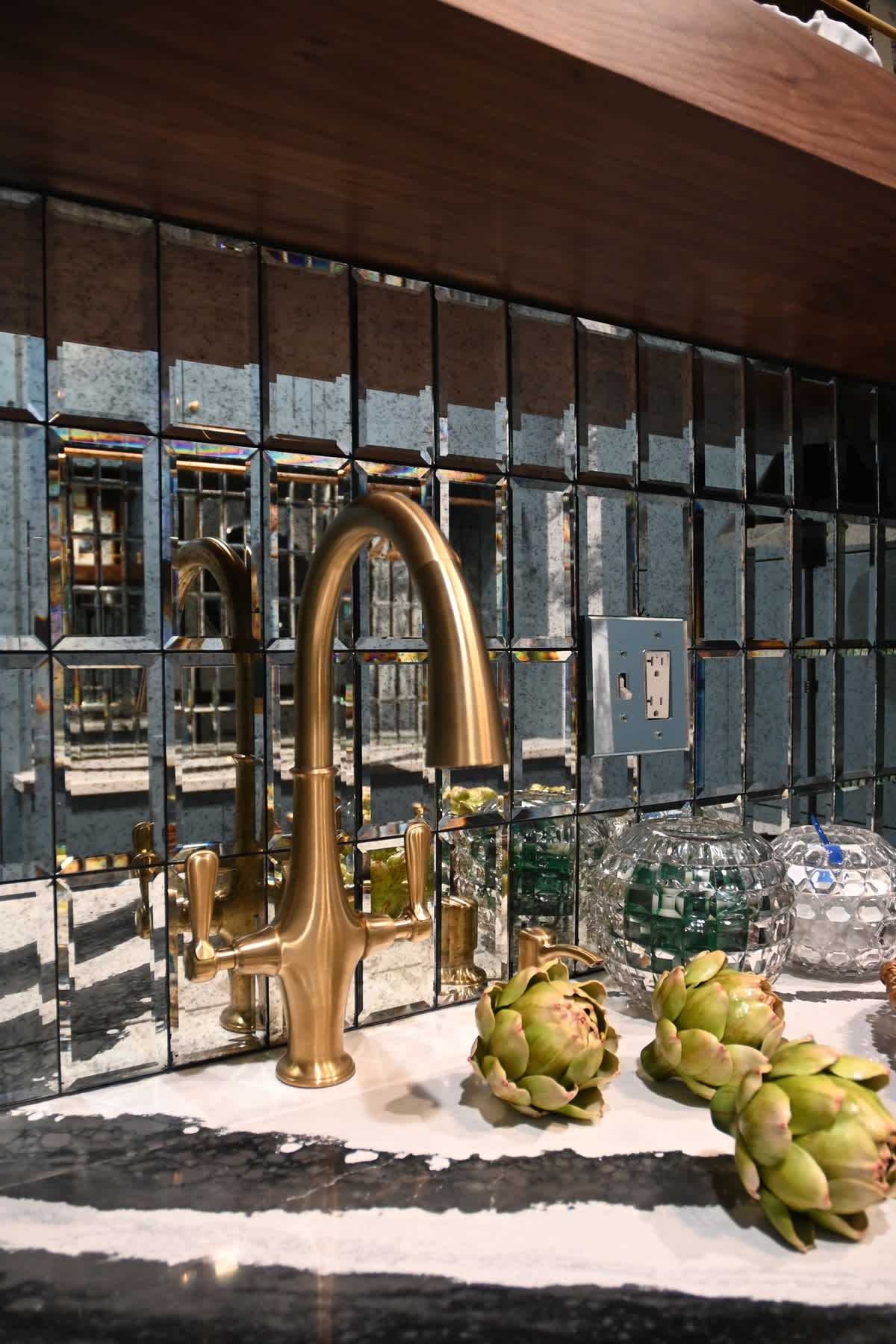 On the rich walnut wood shelf, the vintage glassware adds to the NYC glam factor and sparkles with light. The metal hardware throughout—sink faucet, the cabinet nobs, overhead light fixture—each adds another dimension of reflection.