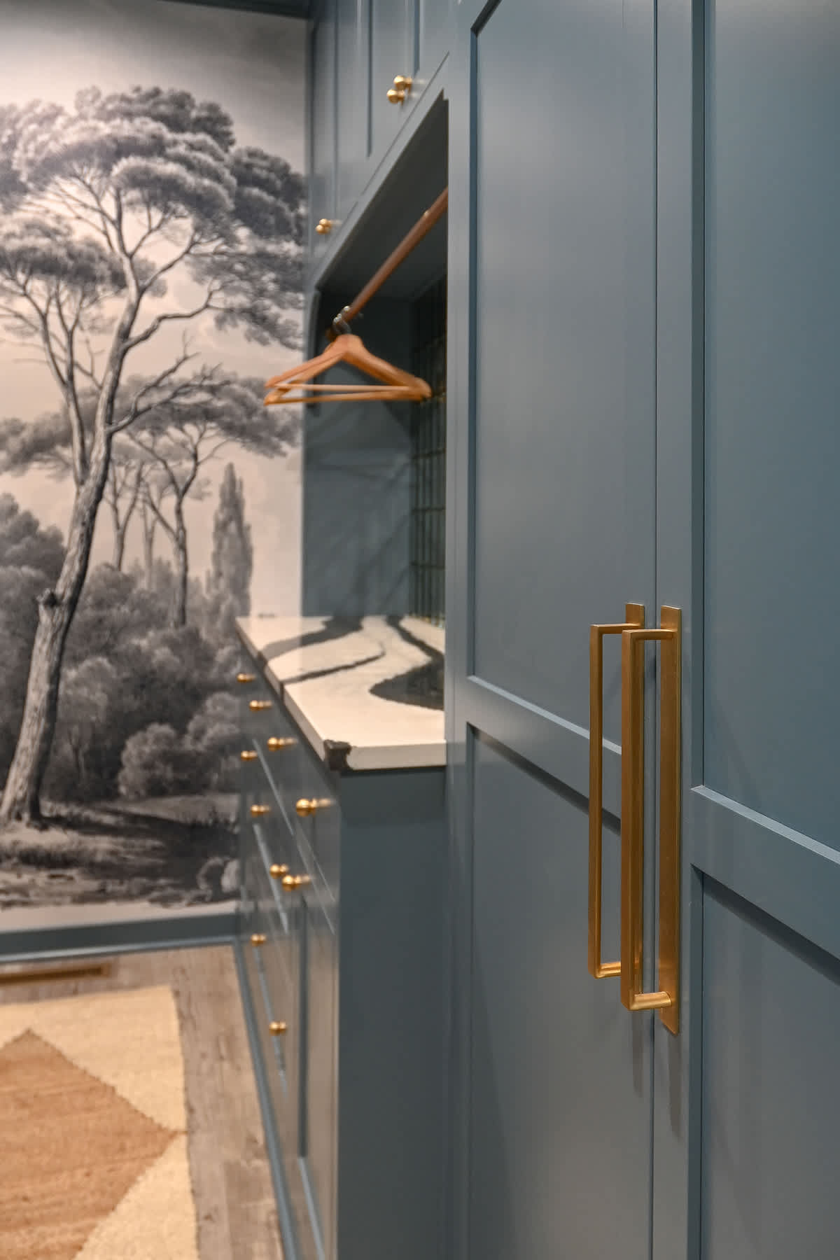 Inspired by the old-school cocktail lounges found in New York City that manage to feel luxe, textured, and inviting even in the tiniest of spaces, she developed a mood board and color palette. Rethinking the configuration and enlisting the services of custom cabinet maker Regalwood Cabinets, she was able to make the small space serve as a laundry room and butler’s pantry, complete with an ice maker, dishwasher, coffee maker, and wet bar.